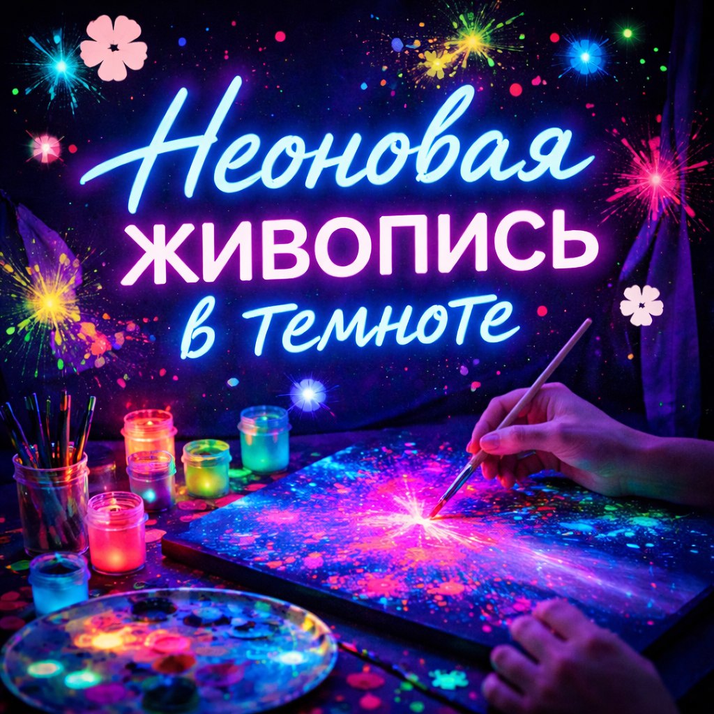 Представь: темнота, ультрафиолет, яркие краски, которые оживают прямо под кистью, и твоя картина, светящаяся изнутри. Мастер-класс по неоновой живописи!